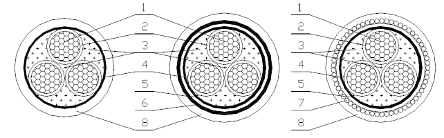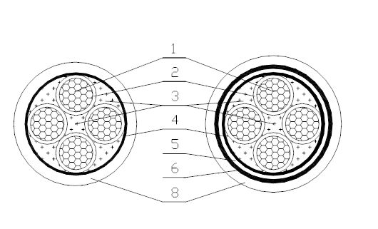 5隔離套(內(nèi)襯層))   6鎧裝鋼帶     7鎧裝鋼絲    8外護(hù)套